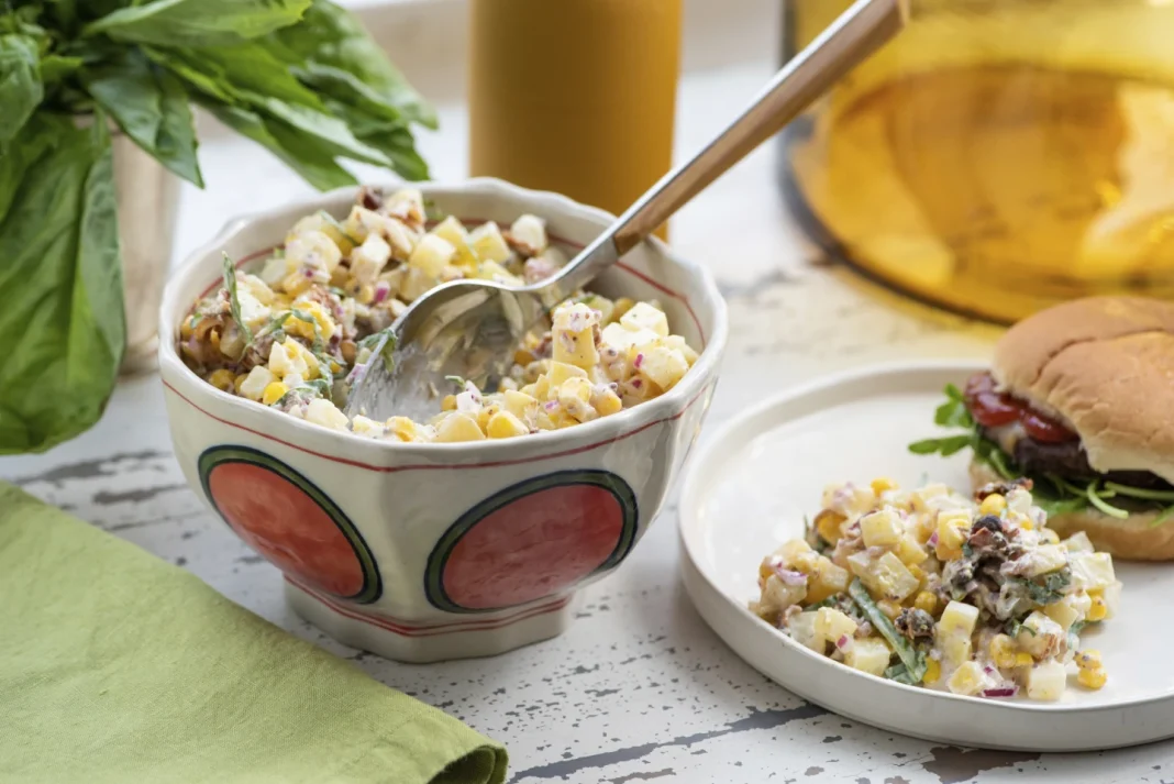 3. Place the warm potatoes and corn, basil and half the bacon in a large bowl. Pour the dressing over it and toss to mix well. Turn into a serving bowl and top with the remainder of the crumbled bacon.