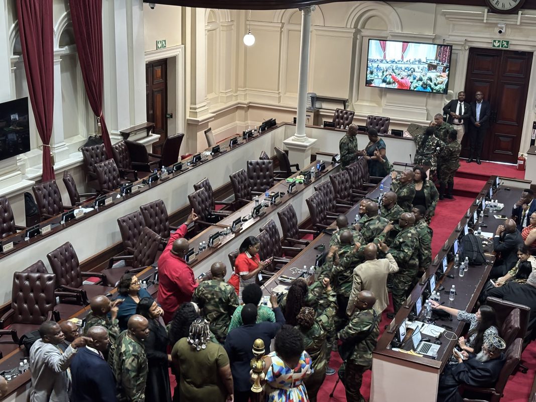 Earlier, proceedings had already been disrupted after MK Party members were denied a secret ballot, leading to singing and defiance directed at the Speaker.