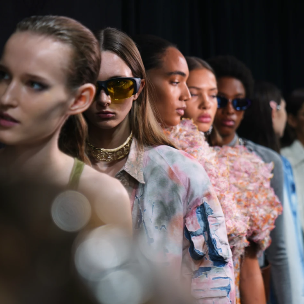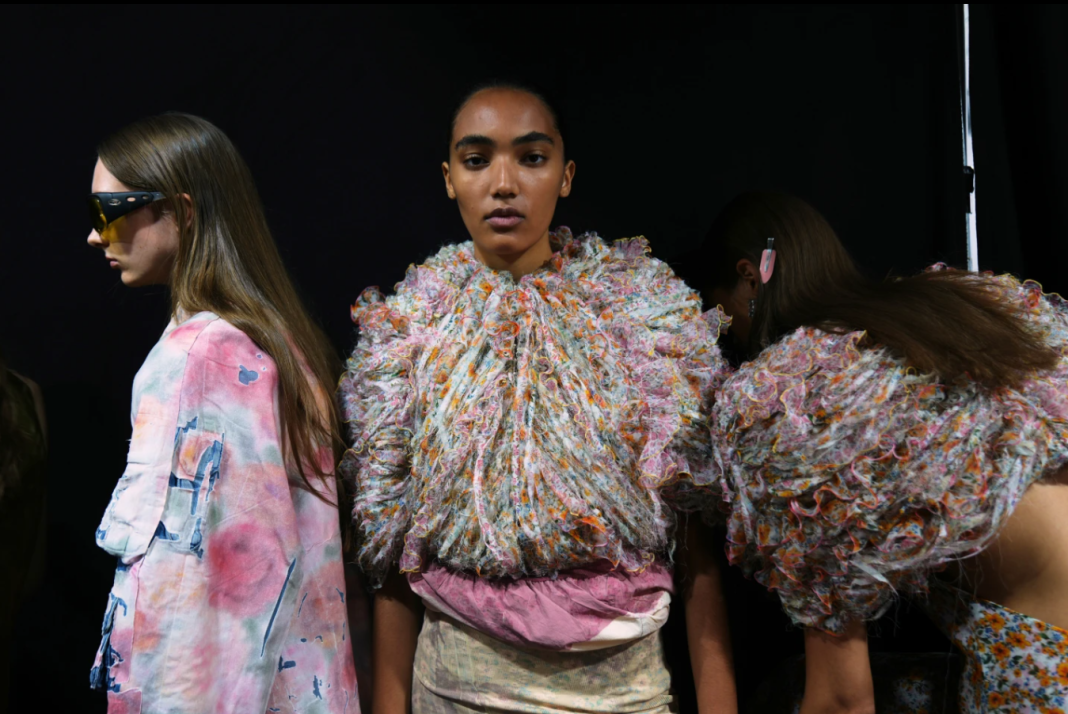 Creative director Glenn Martens created a literal Easter egg hunt, with models standing in big transparent plastic eggs to show off the edgy, youthful brand’s denim-centric distressed and treated looks.