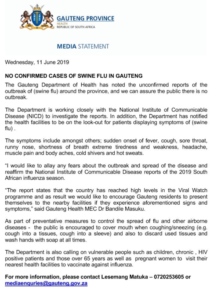 Since April, there have been outbreaks of swine flu in North West, Mpumalanga, Gauteng and Free State provinces.