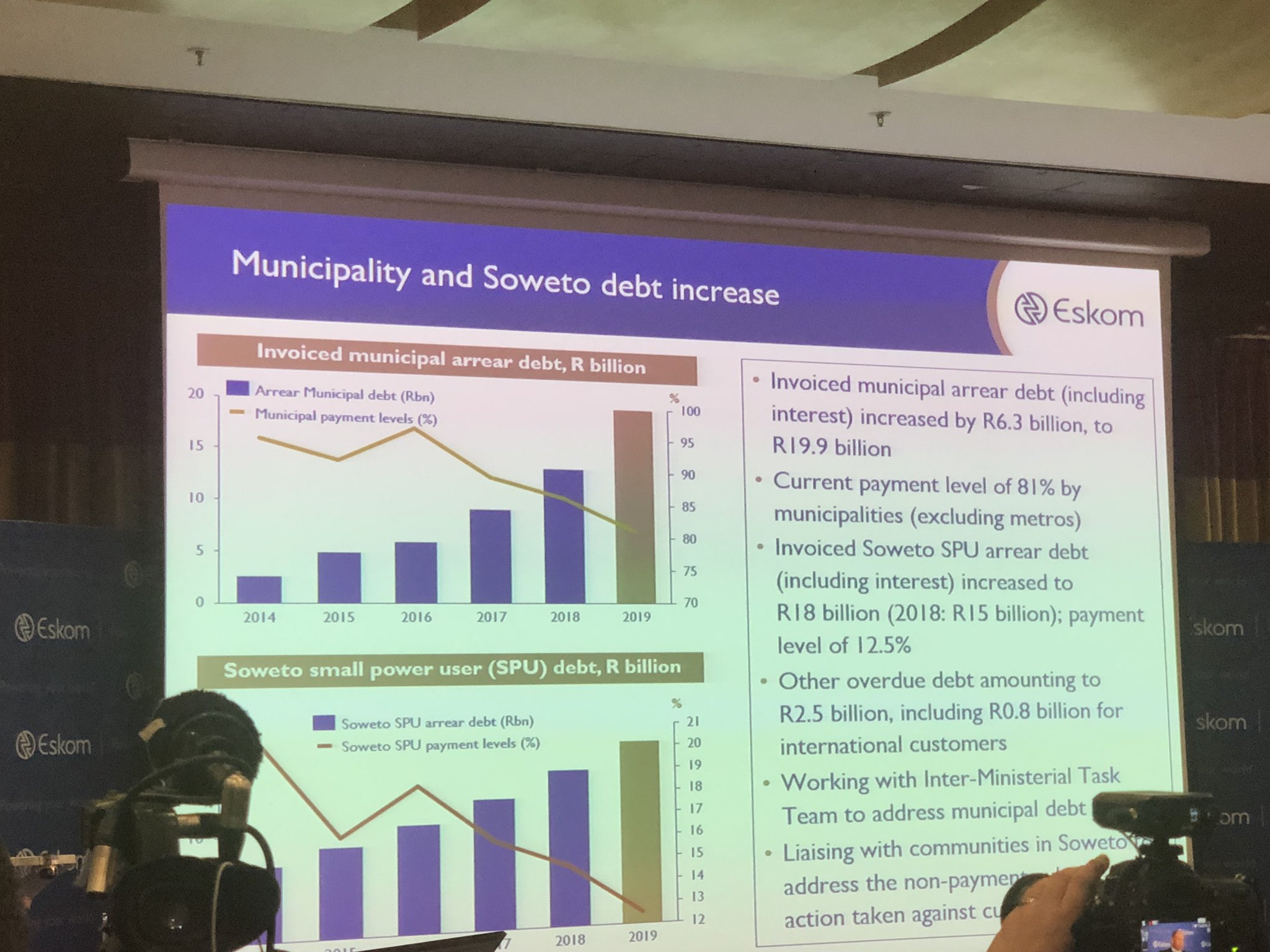 Releasing the company’s financial results Tuesday, outgoing CEO Phakami Hadebe said the debt excludes Soweto with that debt increasing from R15bn in 2018 to R18bn in 2019.