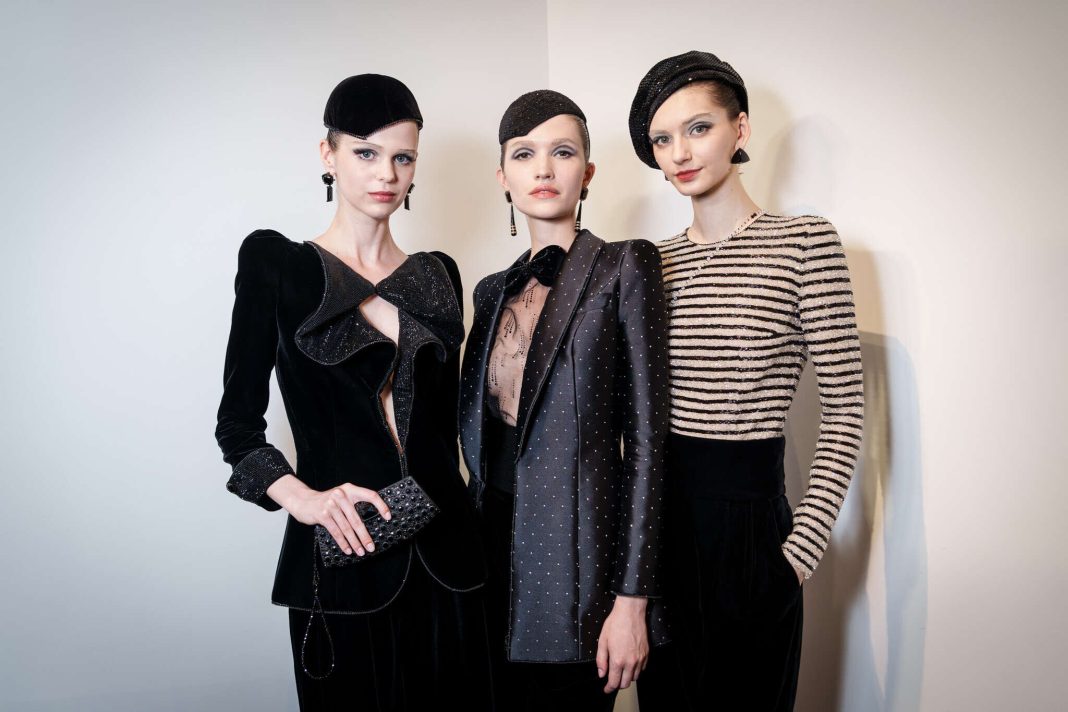 Giorgio Armani showed his latest Privé haute couture collection at the label’s gilded Paris headquarters on Tuesday, displaying black velvet evening wear with shimmery touches on the runway – once again, without the Italian designer, who continues to rest at home.