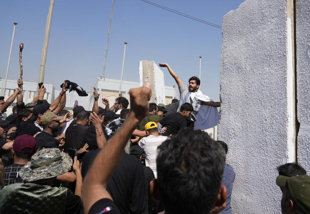 During Monday’s violence, hundreds of protesters pulled down the cement barriers outside the government palace with ropes and breached the palace gates. Many rushed into the lavish salons and marbled halls of the palace, a key meeting place for Iraqi heads of state and foreign dignitaries.