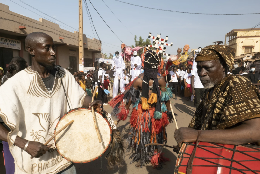 In a residential neighborhood in Mali’s capital, a parade of giant marionettes marched through the streets as motorcycles and taxis squeezed through the busy road, stopping at intervals to give way for the puppets.
