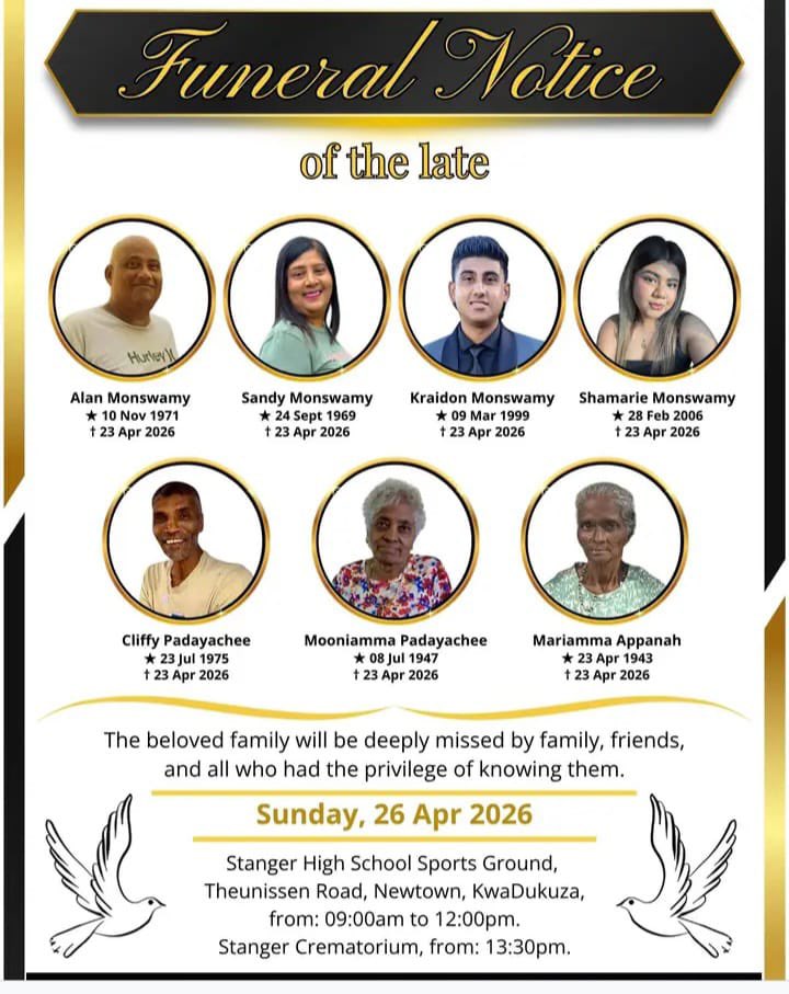 Hundreds gathered at the Stanger High School Sports Ground to bid farewell to Alan and Sandy Monswamy, their children Kraidon and Shamaria, and relatives Cliffy Padayachee, Mooniamma Padayachee, and Mariamma Appanah, whose abduction and killing last week has shocked the country.