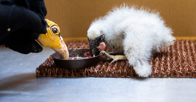 Staff at Prague Zoo had to start hand-feeding the lesser yellow-headed vultures when their parents stopped nesting. After using the approach with other birds, they quickly made a hand puppet that looks like an adult vulture’s head.