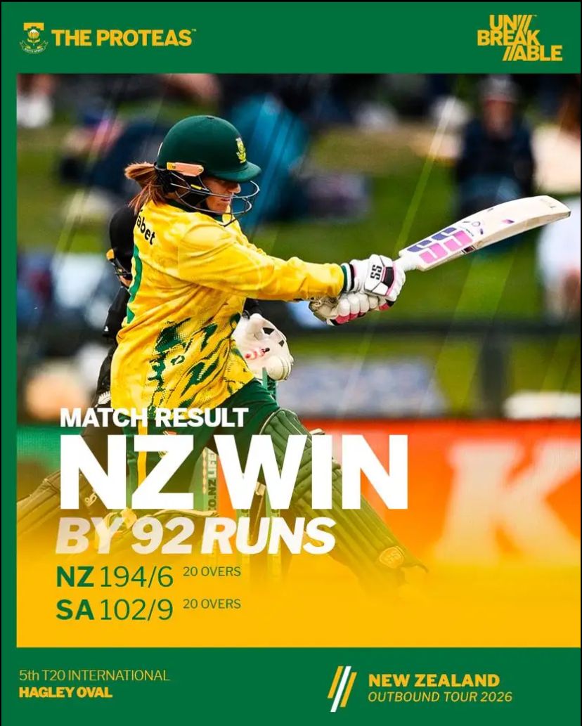 The South African women’s cricket team ended their New Zealand tour with a 92-run defeat in the fifth and final T20 international in Christchurch on Wednesday, as the hosts wrapped up the series 4-1.
