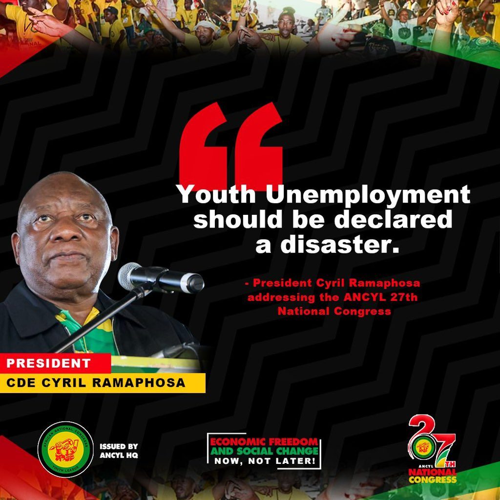“Youth unemployment should be declared a disaster,” ANC President Cde Cyril Ramaphosa told delegates at the ANC Youth League’s 27th National Congress.