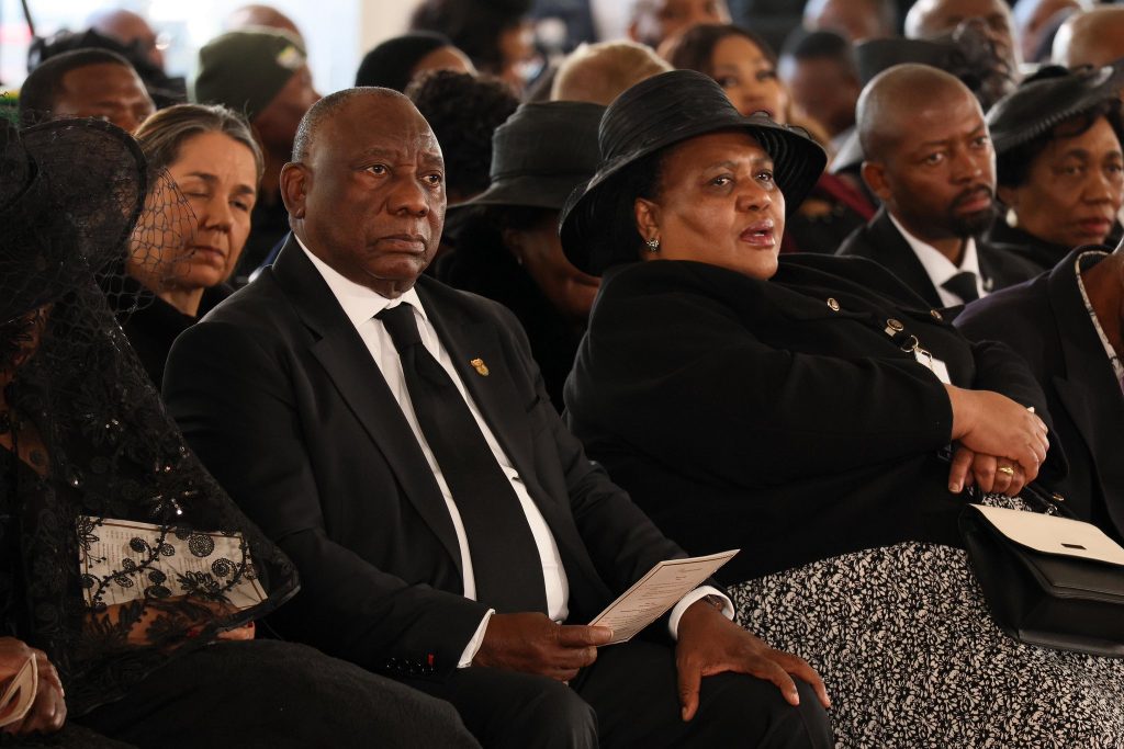 After the tributes and prayers, the SA National Defence Force led the final procession, where Ramaphosa handed the national flag to the Mabuza family.