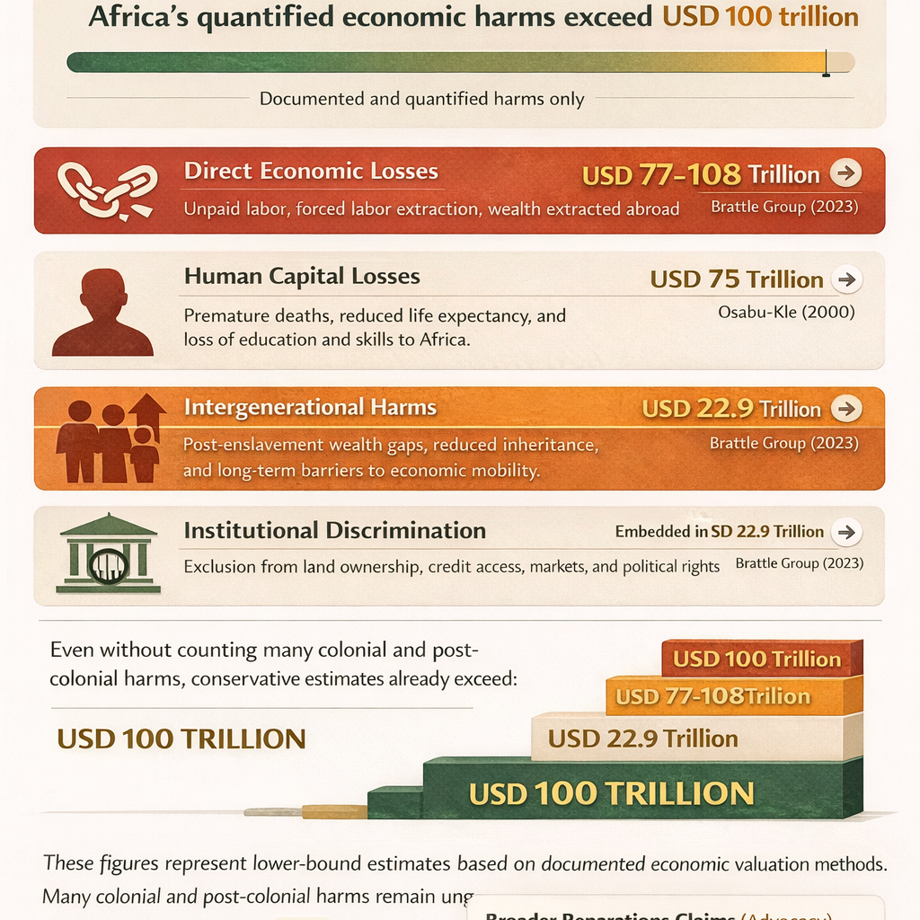 This is the conservative estimate attached to a fraction of the economic harm caused by the transatlantic slave trade, according to studies cited in reparations scholarship and econometric assessments compiled by the Pan-African Progressive Front (PPF). These estimates focus primarily on the monetary value of unpaid African labor extracted during slavery alone. They do not yet account fully for colonial extraction, post-emancipation exclusion, or contemporary structural penalties imposed on African economies.