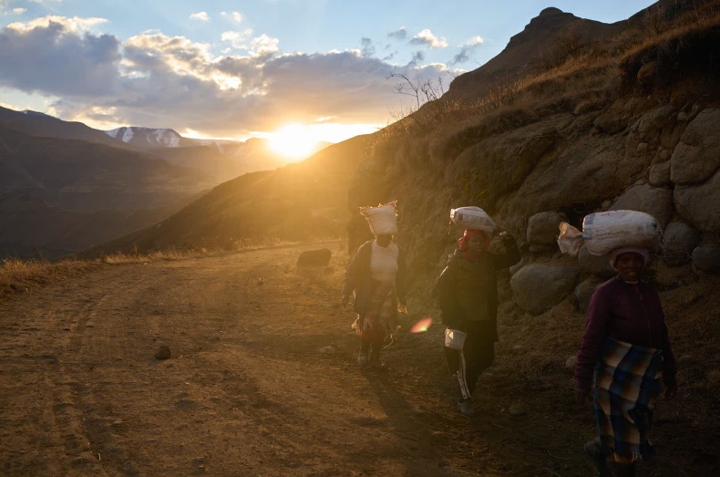 Women carry bags of food in the mountains of Ha Lejone, Lesotho, July 14, 2025. (AP Photo/Bram Janssen)