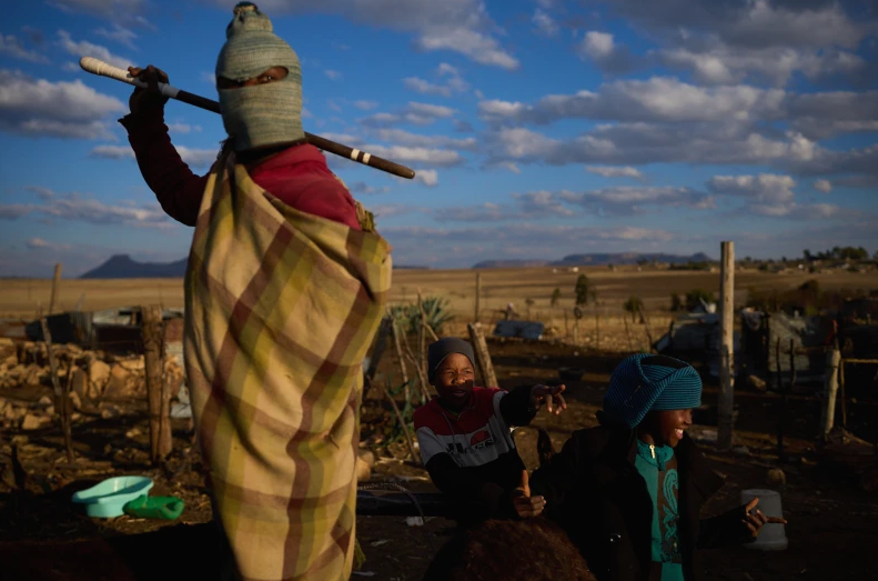 Boys stand outside their homes after a day of work in Mafeteng, Lesotho, July 12, 2025. (AP Photo/Bram Janssen)