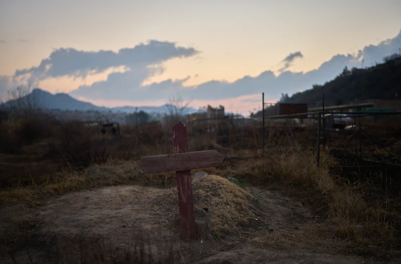A cross is seen at a cemetery where hundreds of people who died of AIDS are buried in Maseru, Lesotho, July 20, 2025. (AP Photo/Bram Janssen)