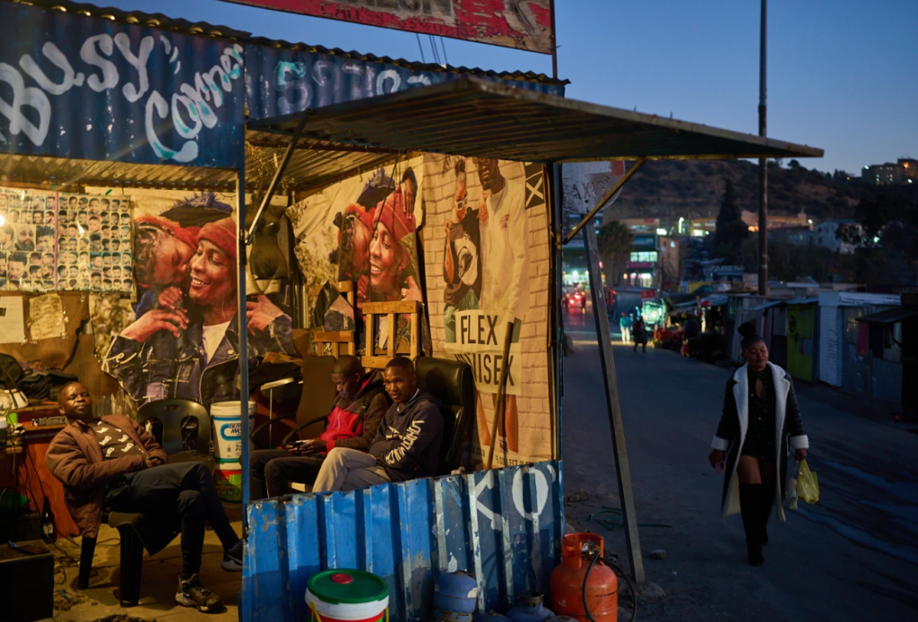 A woman passes a barber shop with men sitting inside at the end of the day in Maseru, Lesotho, July 18, 2025. (AP Photo/Bram Janssen)