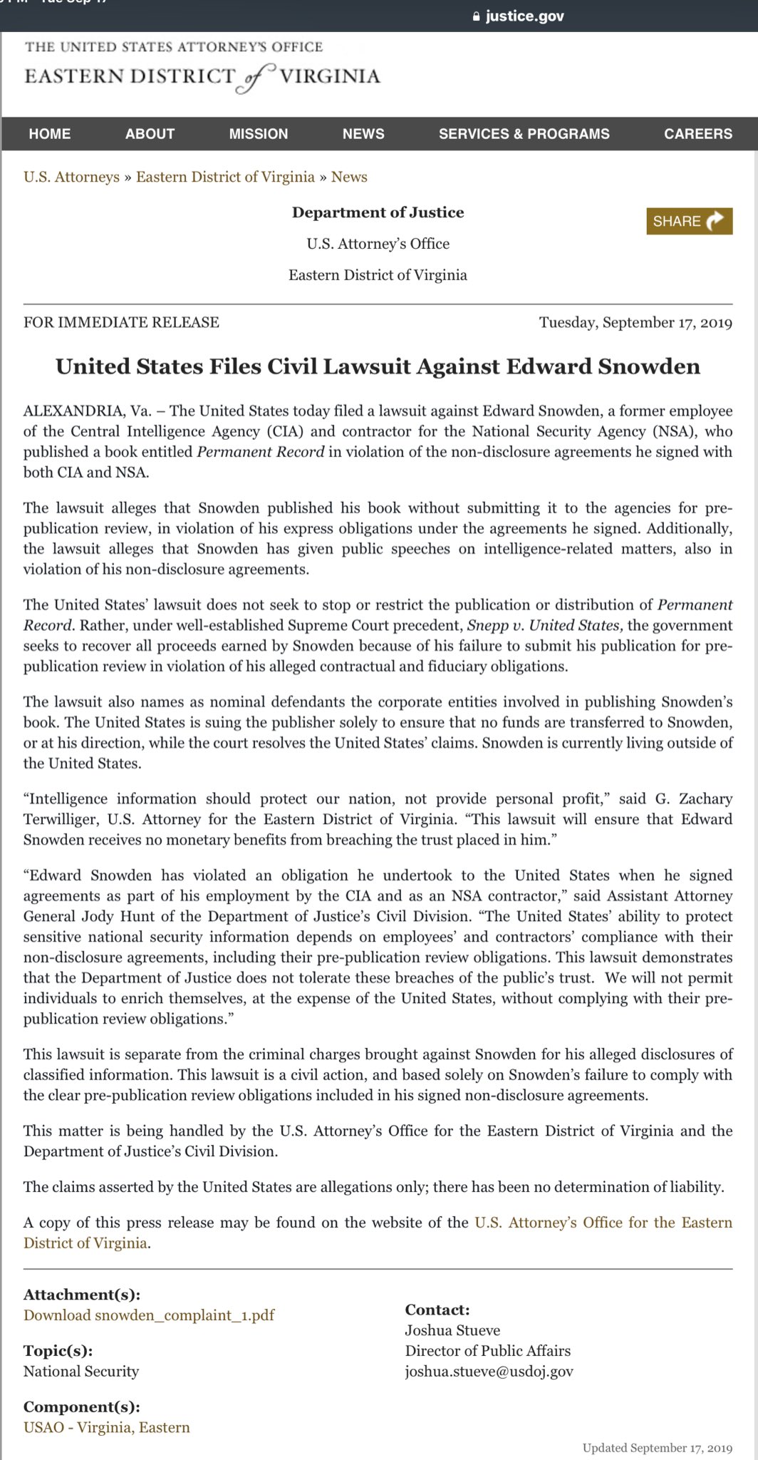 “This lawsuit will ensure that Edward Snowden receives no monetary benefits from breaching the trust placed in him.“