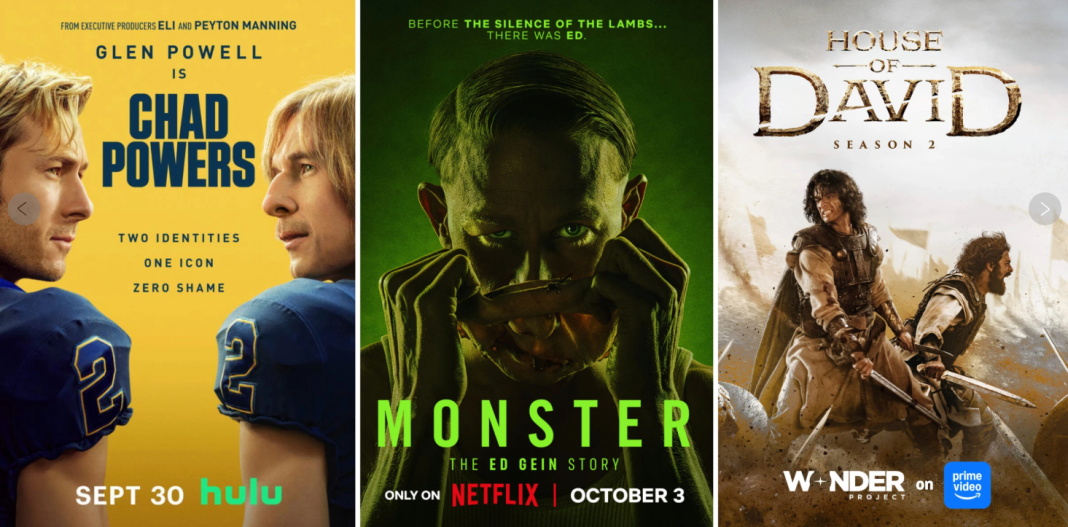 — Charlie Hunnam also transforms himself for Netflix’s true crime dramatization called “Monster: The Ed Gein Story.” Hunnam plays Gein, a convicted murderer and suspected serial killer from the 1950s. Cocreated by Ryan Murphy and Ian Brennan, the “Monster” anthologies tend to illustrate the impact of true crime on pop culture. In this “Monster,” Tom Hollander plays Alfred Hitchcock, whose movie “Psycho” was inspired by Gein. Olivia Williams and Laurie Metcalf also star. It debuts Friday, Oct. 3.